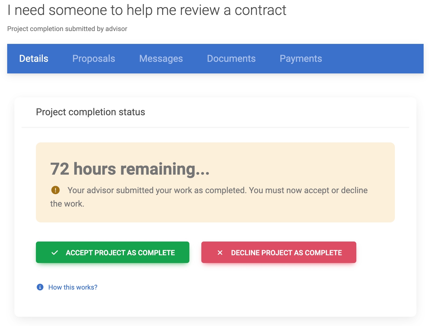 Upon completion of the project, the advisor can mark it as finished, allowing the client to evaluate the work done. The client is given a 72-hour window to either approve or reject the submitted project. Based on the initial proposal details, the client has the option to request revisions or additional updates. Once the client is content with the outcome, they can confirm the project as successfully completed.