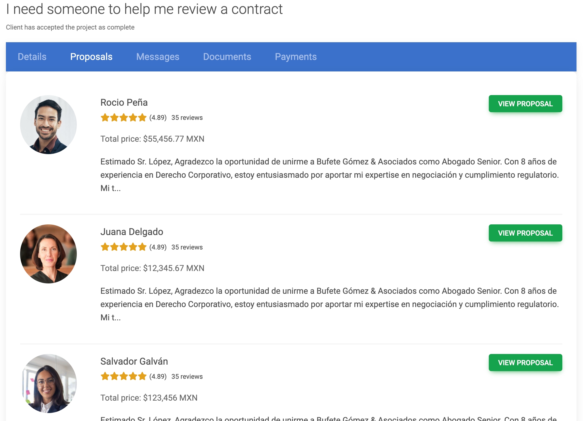Upon finding a proposal and an advisor that meets their needs, clients can approve the proposal, thereby enabling the advisor to commence work on the assignment.